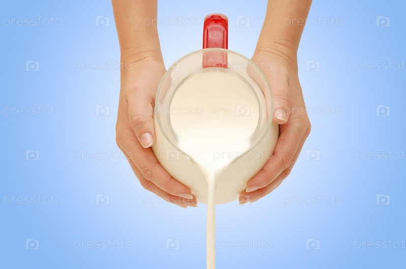 Молоко льют из кувшина на голубом фоне