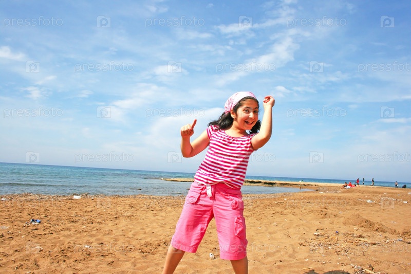 Счастливая девочка танцует на пляже
