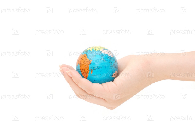 Небольшой глобус в женской руке на белом фоне