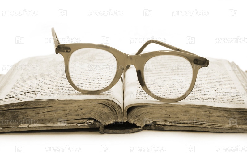 Старинная книга и очки на белом фоне