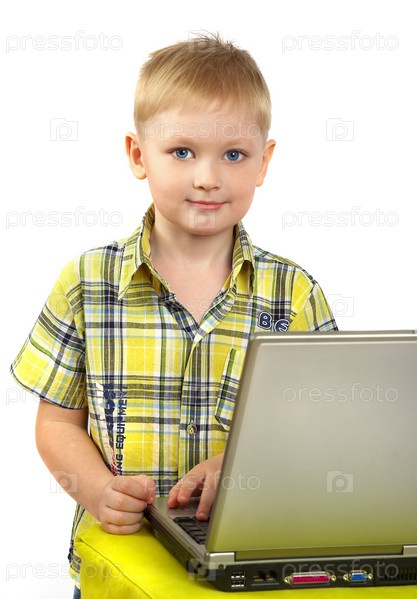 Светловолосый мальчик с ноутбуком на белом фоне