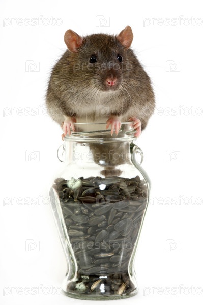 Большая серая крыса на белом фоне с семечками подсолнечника