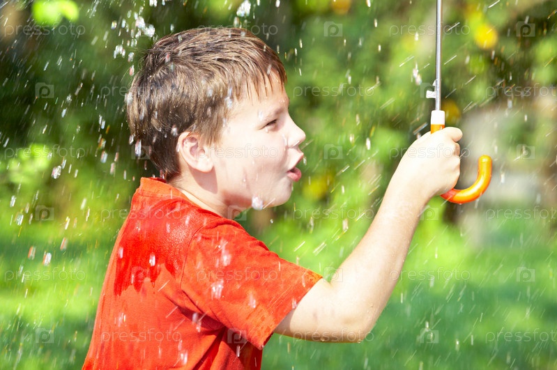 Мальчик с зонтиком под дождем