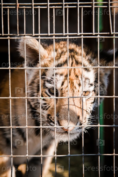 Тигренок в зоопарке сидит в клетке