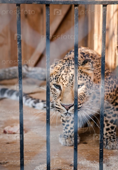 Леопард в зоопарке сидит в клетке