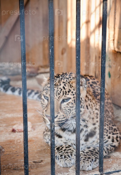 Леопард в зоопарке лежит в клетке