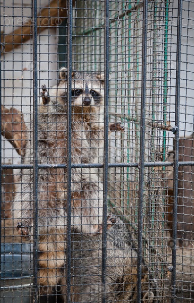 Енот в зоопарке сидит в клетке