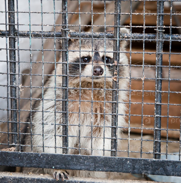 Енот в зоопарке сидит в клетке