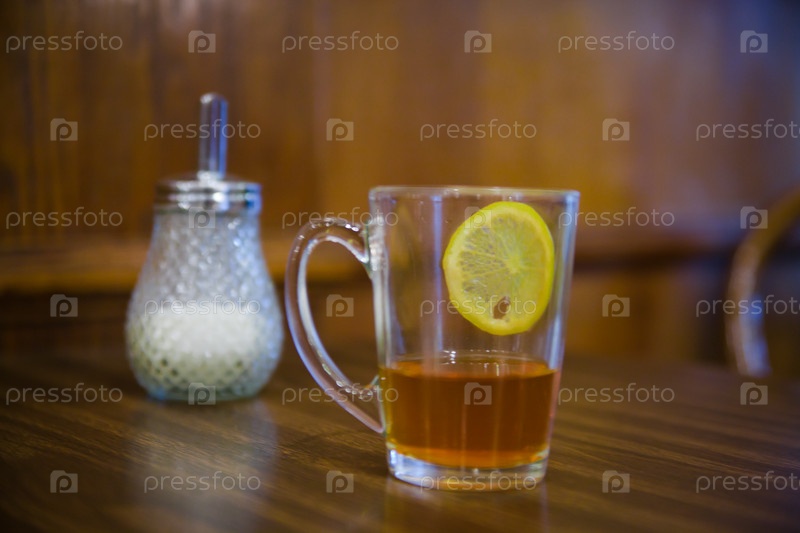 Стеклянная кружка с чаем и сахарница на столе