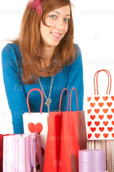 Молодая женщина с сумками, изолированная на белом фоне
