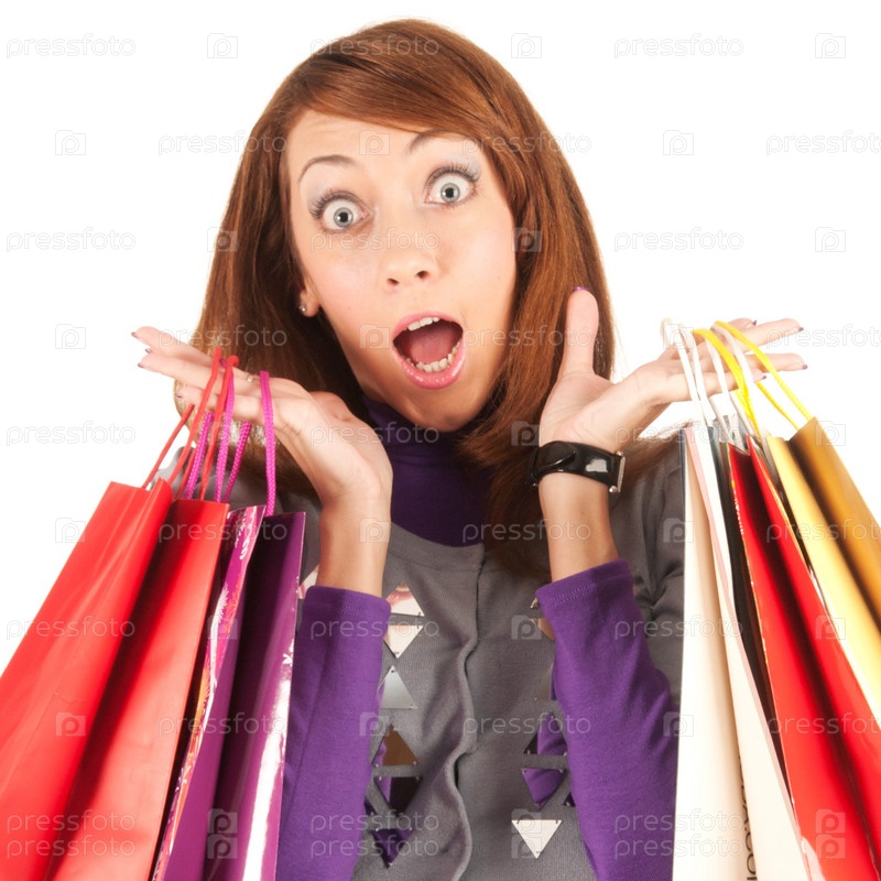 Молодая женщина с сумками, изолированная на белом фоне