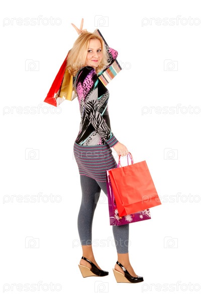 Молодая женщина с сумками, изолированная на белом фоне