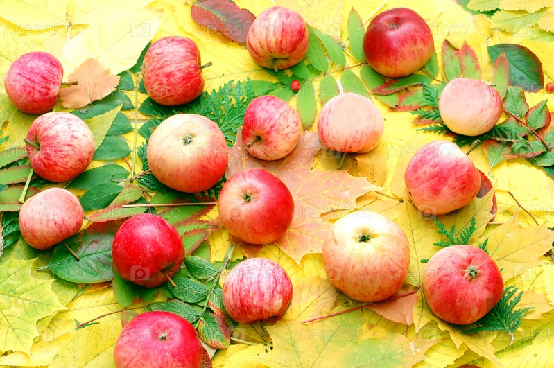 Фон из спелых яблок и осенних листьев