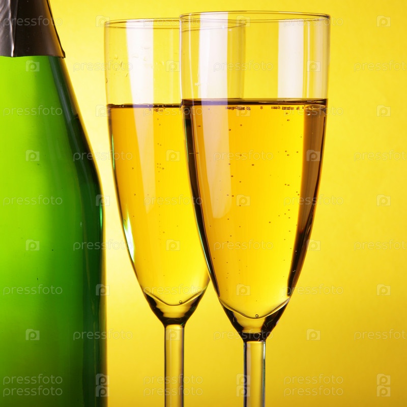 Бутылка и бокалы с шампанским на желтом фоне