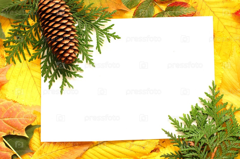 Осенние желтые опавшие листья и еловые шишки вокруг чистого листа бумаги