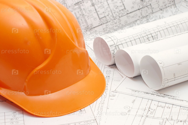 Оранжевая каска рядом с чертежами