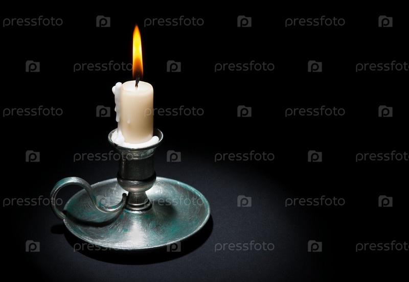 Зажженная свеча в старой оловянной подсвечнике на черном фоне