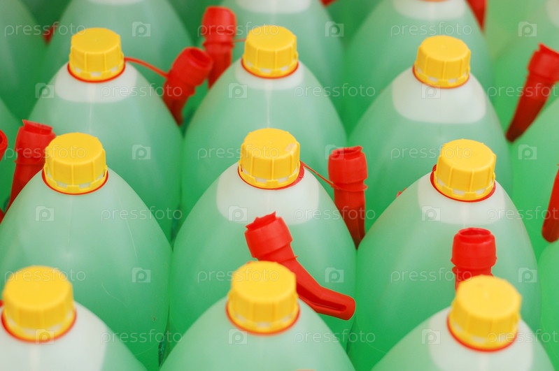Бутылки с зеленой стеклоомывающей жидкостью