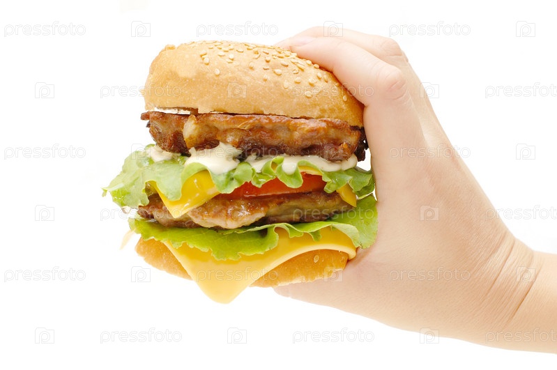 Двойной гамбургер в руке на белом фоне
