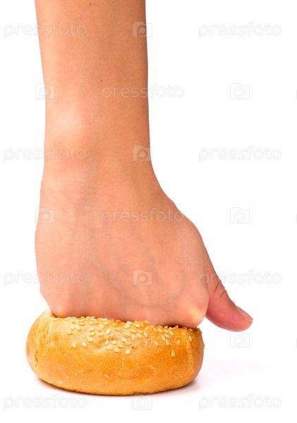 Кулак надавливает сверху на булочку с кунжутом, изолированную на белом фоне