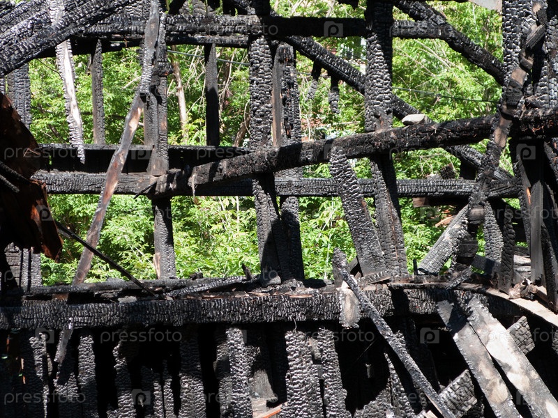 Разрушенный деревянный домик сгорел от пожара из-за черного угля