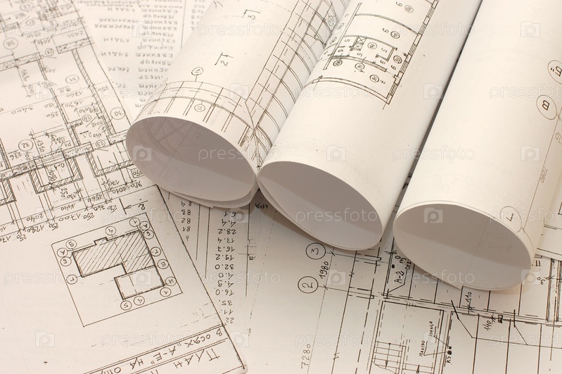 Множество чертежей, расправленных и в рулонах
