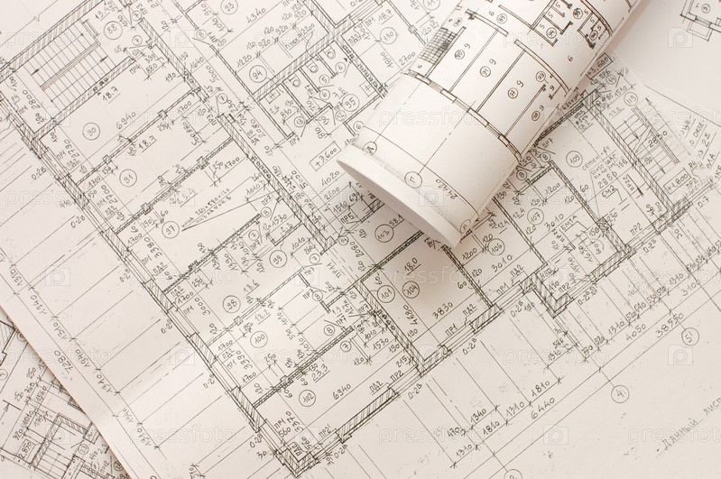 Множество чертежей, расправленных и в рулонах