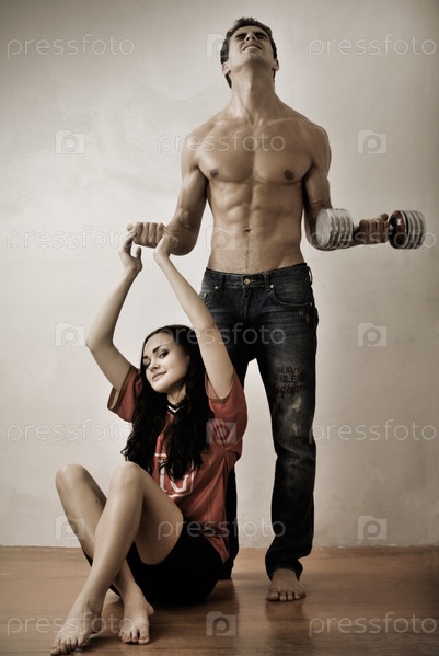 Парень и девушка с гантелью
