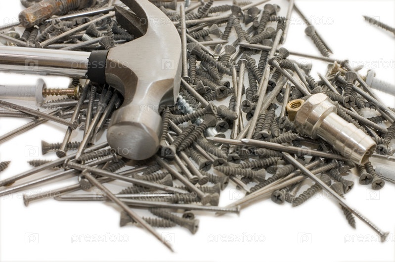 Молоток и гвозди на белом фоне