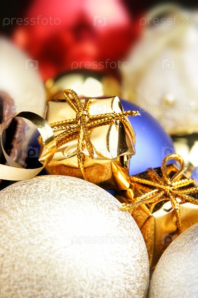 Золотые коробочки и рождественские шары крупным планом