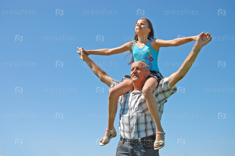 Дедушка с внучкой на фоне неба