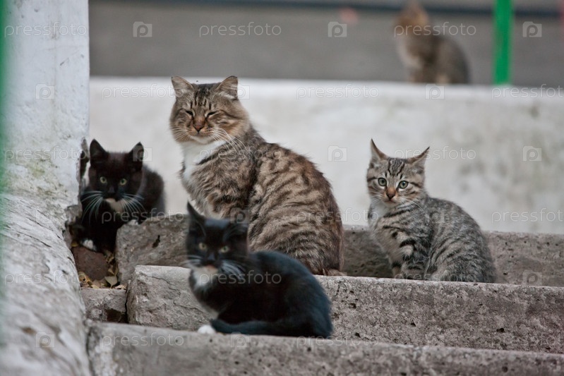 Кошачья семья на бетонной лестнице