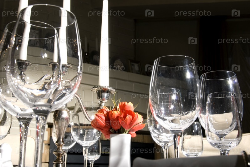 Обеденный стол с бокалами, свечами и букетом тюльпанов крупным планом