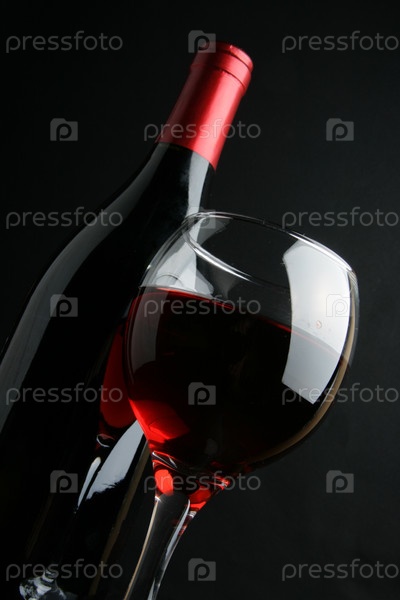 Бокал и бутылка вина на черном фоне