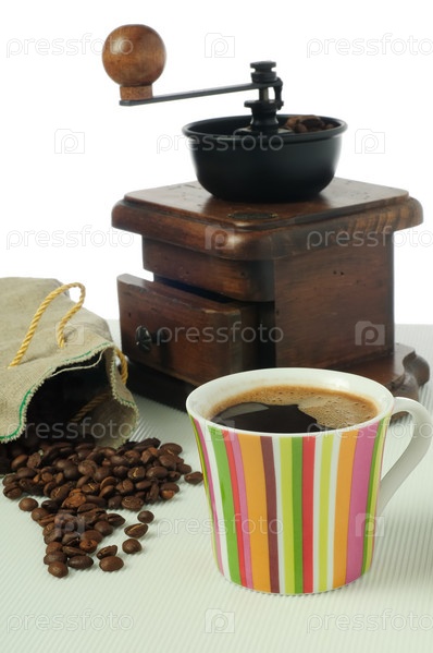 Кофемолка,чашка с кофе,зерна кофейные на белом фоне