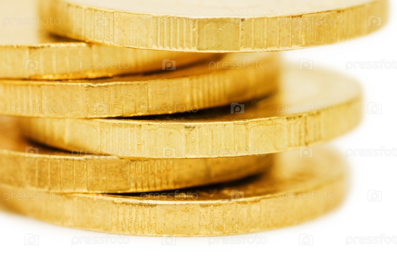 Золотые монеты крупным планом на белом фоне