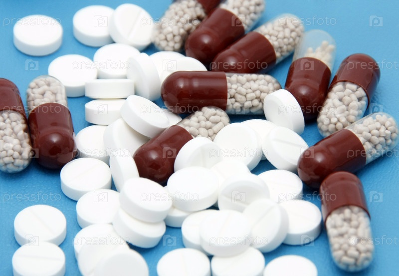 Таблетки и капсулы на голубом фоне