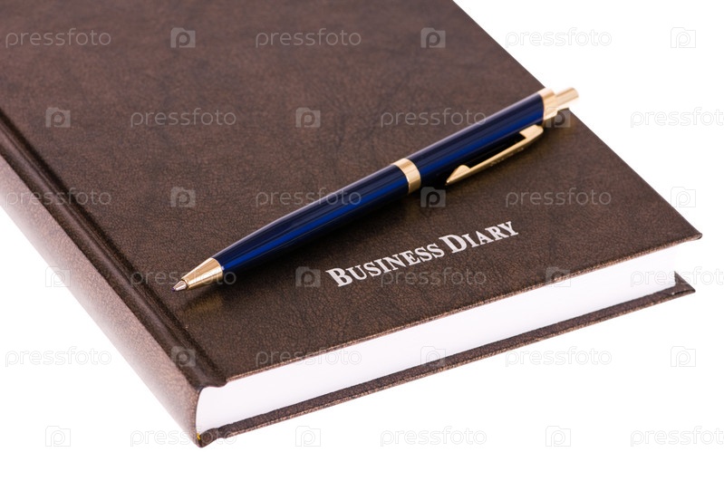 Ежедневник и ручка крупным планом на белом фоне