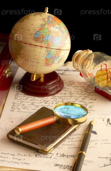 Глобус, лупа и блокнот на старых рукописях