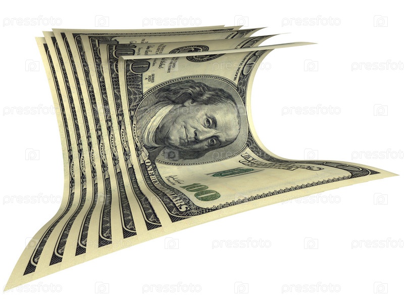 Динамическая композиция нескольких долларовых банкнот, изолированных на белом