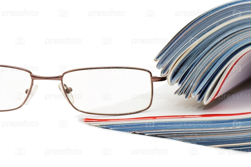 Стопка журналов с очками крупным планом