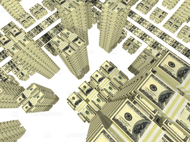 Куча купюр, размещенных как улицы и здания города изолированные на белом