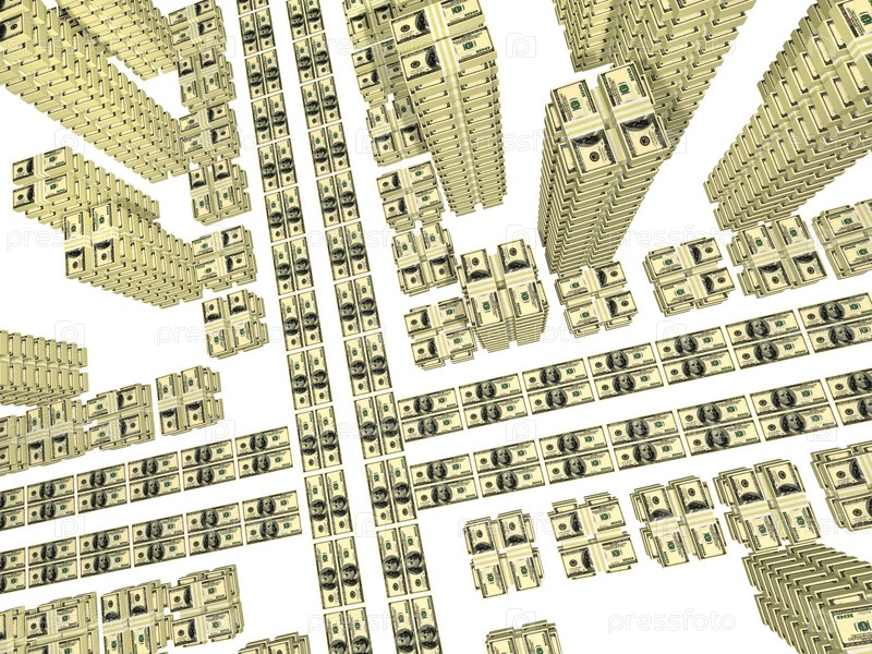 Куча купюр, размещенных как улицы и здания города изолированные на белом