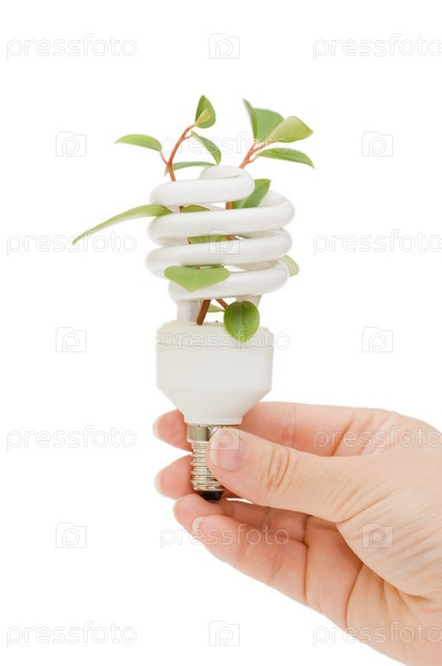 Энергосберегающая лампа с зеленым растенем в руке на белом фоне