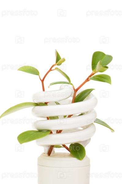 Энергосберегающая лампа с зеленым растением на белом фоне