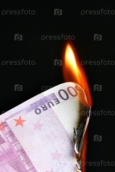 Горящая банкнота достоинством 500 евро на черном фоне