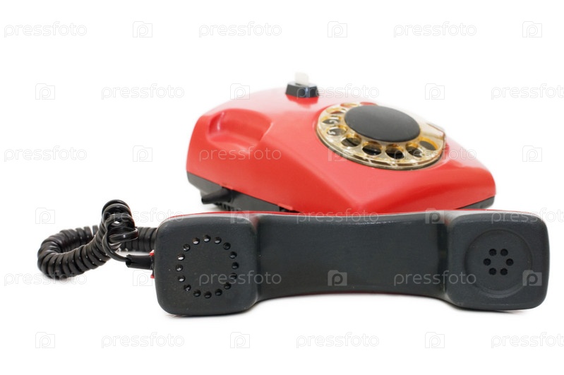 Красный старый телефонный аппарат на белом фоне