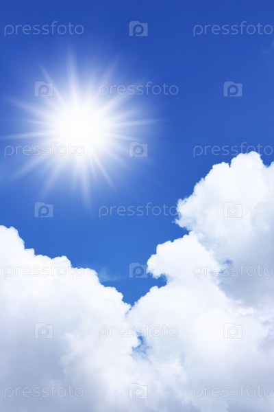 Яркое солнце и тучи на голубом небе