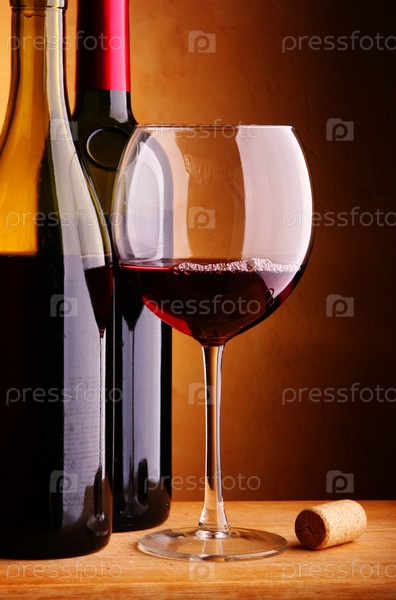 Натюрморт с двумя бутылками и бокалом красного вина