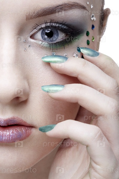 Половина лица девушки с ярким макияжем и стразами